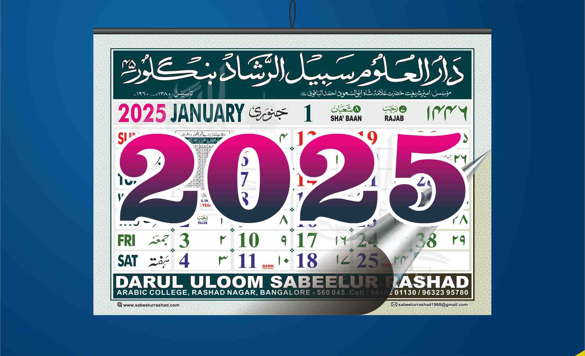 بارہ بڑے صفحات پر مشتمل ، دیدہ زیب کلر ، خوشنما ڈیزائن اور سابقہ روایات کا حامل کیالنڈر دارالعلوم سبیل الرشاد بنگلور منظر عام پر آچکا ہے ، یہ ایسا کیالنڈر ہے جسے آپ خرید کر اپنے گھر ، دفتر اور جائے کاروبار کی زینت بنانا بھی پسند کریں گےاور دوستوں ، رشتے داروں میں تحفہ دیتے ہوئے بھی فخر محسوس کریں گے ۔ جلد خریدیے ، اس سے پہلے کہ ختم ہوجائے ۔ قیمت بالکل مناسب !