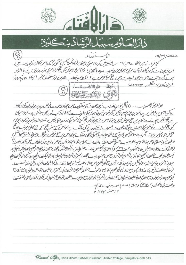 کیا فرماتے ہیں علمائے دین اس مسئلے میں کہ میری بیوی (صائمہ یاسمین منشی)کے پاس کافی زیورات ہیں،ان زیورات کی زکوٰۃ ادا کرنامیری بیوی پر واجب ہے یا مجھ پر ؟ نیز میری بیوی کو حج کرانا میری ذمہ داری ہے یا مالدار ہونے کی وجہ سے اس پر خوداپنے پیسے میں حج کرنا فرض ہے ؟ فقط سید قطب الدین1/16۔ رویپا روڈ، فریزر ٹاؤن ، بنگلور