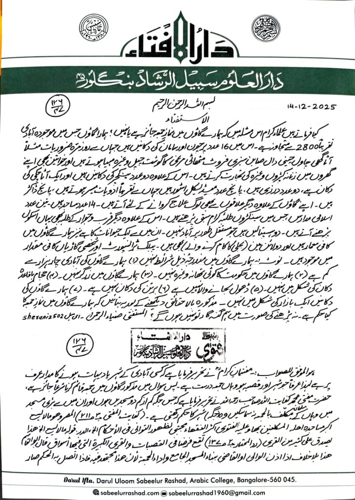 کیا فرماتے علمائے کرام اس مسئلے میں کہ ہمارے گاؤں میں نماز ِجمعہ جائز ہے یا نہیں؟۔ ہمارا گاؤں جس میں موجودہ آبادی تقریباً 2800 سے متجاوز ہے۔ اس میں 16 عدد پر چوںاور سامان کی دکانیں ہیں جہاں سے روزمرہ ضروریات مثلاً آٹا گھی، چاول ،چینی، دال، صابن ، سبزی ،فروٹ،مٹھائی، مرغی کا گوشت ،چپل وغیرہ مہیا ہوتے ہیں ۔اور خواتین بھی اپنے گھروں میں زنانہ کپڑوں، وغیرہ کی تجارت کرتے ہیں ۔اس کے علاوہ دو عدد پنکچر کی دکانیں ہیں ۔اور ایک آٹا چکی کی دکان ہے۔ دوعدد درزی ہے،پانچ عدد میڈیکل اسٹور ہیں جہاں سے تقریباً ادویات میسر ہوتے ہیں ۔پانچ ڈاکٹر ہیں ۔اپنے گاؤں کے علاوہ دیگر علاقوں سے بھی لوگ علاج کروانے کے لیے آتے ہیں ۔14 عدد مساجد ہیں۔ تین عدد اسلامی مدارس جس میں سینکڑوں طلبائےکرام سبق پڑھتے ہیں ۔اس کے علاوہ تین عدد اسکولز ہیں ۔ایک گورنمنٹ ہائی سکول ہے اور ایک پرائمری گرلز سکول ہے اور ایک پرائیوٹ( پبلک) اسکول ہے ۔ ہمارے گاؤں کے علاؤہ دیگر قرب وجوار کے طلباء بھی یہاں اسکول پڑھنے آتے ہیں ۔دو ہسپتالیں ہیں جو مستقل طور پر آباد نہیں۔ ان میں سے ایک حیوانات کا ہے ۔ نیز ہمارے گاؤں میں کافی معمار ہیں اور دو لائن مین(بجلی کاکام کرنے والے)بھی ہیں۔ پبلک ٹرانسپورٹ اور شخصی گاڑی کافی مقدار میں موجود ہیں
